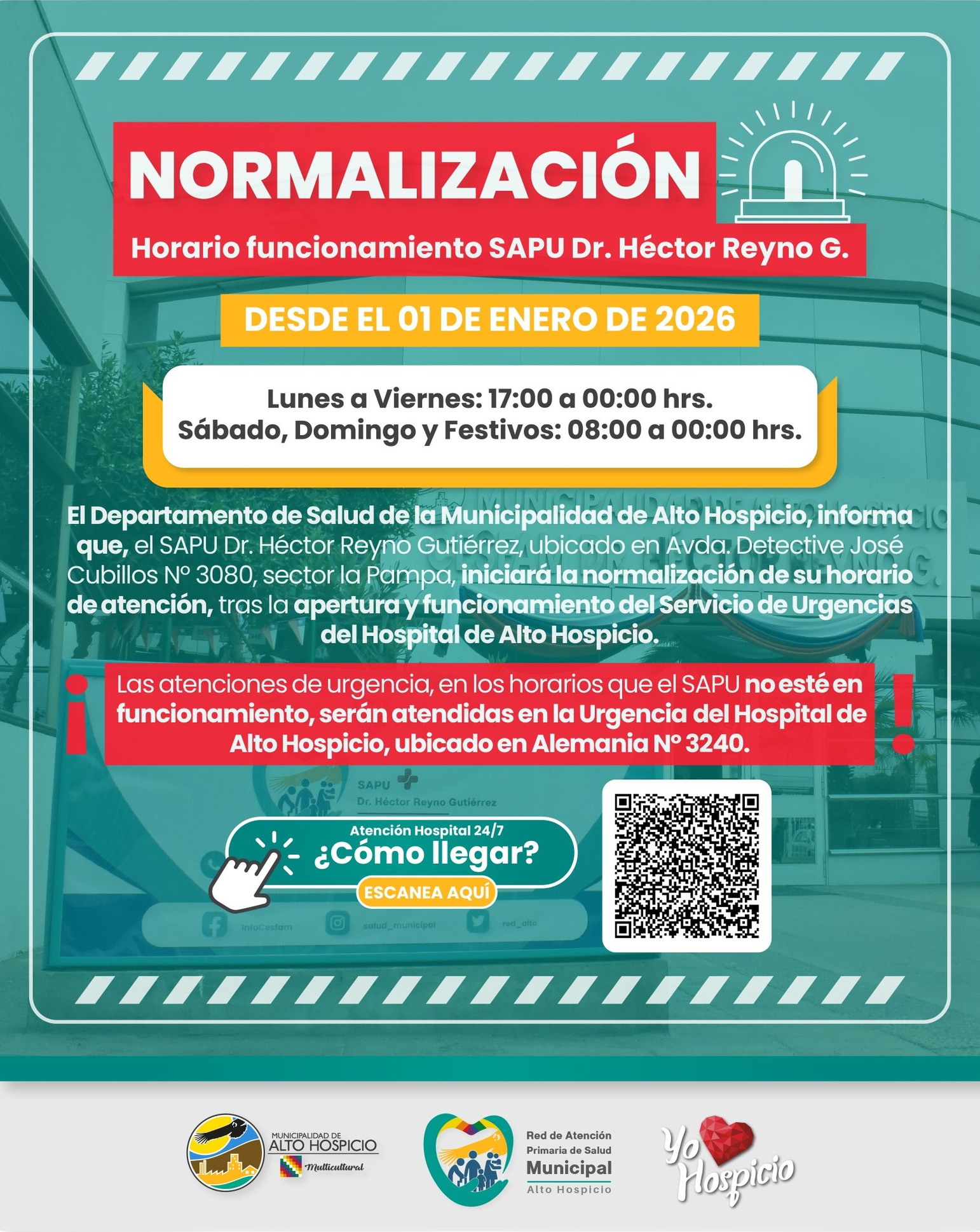 Toda la comuna de Alto Hospicio cuenta con una cobertura total de Salud en el cual los recintos de Salud despliegan sus actividades como atenciones en terreno, intervenciones, campañas de vacunación, visitas domiciliarias, inscripciones a la Red de Salud, entre otras prestaciones. Para visualizar más detalles acerca de los recintos de Salud de Alto Hospicio, haga clic sobre el icono de la flecha.