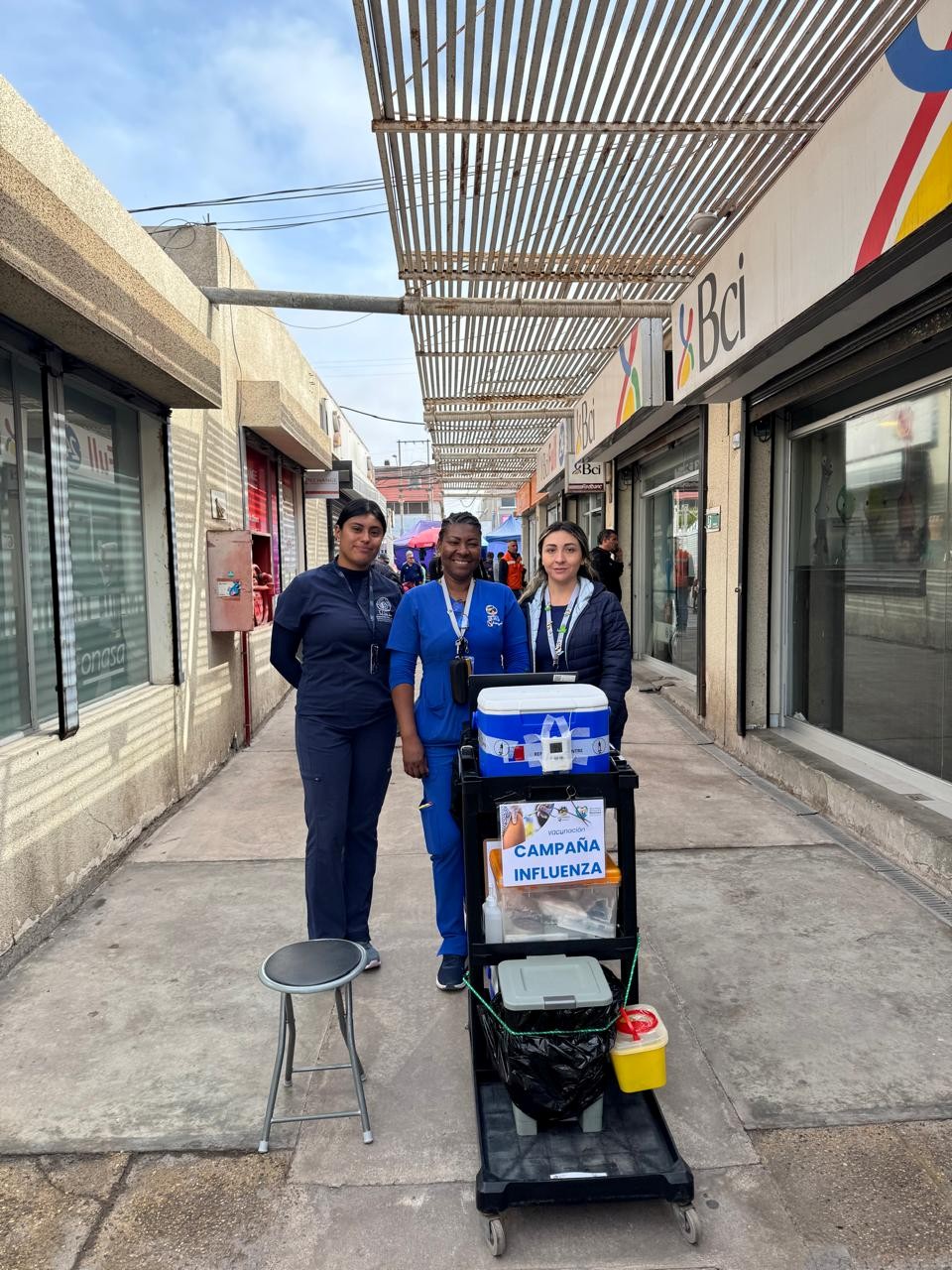 Este 6 de mayo, funcionarias de la Red de Salud de Alto Hospicio se trasladaron hasta el sector de la placa bancaria para realizar una jornada de vacunación contra el COVID-19 y la influenza.